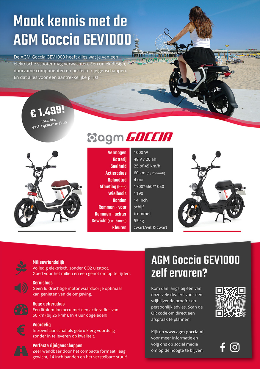 De AGM Goccia heeft alles wat je van een elektrische scooter mag verwachten. Een uniek design, duurzame componenten en perfecte rijeigenschappen.
